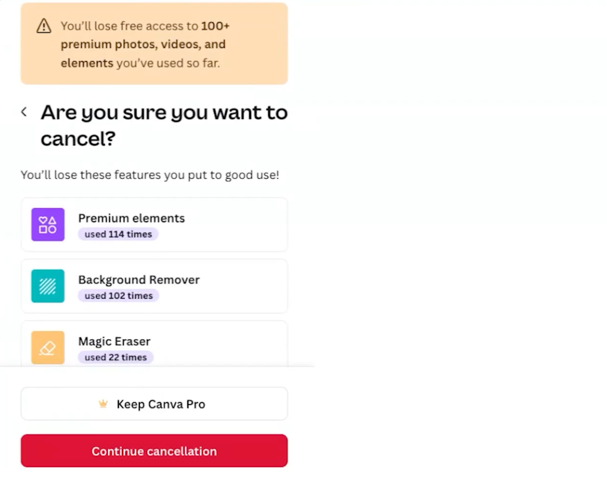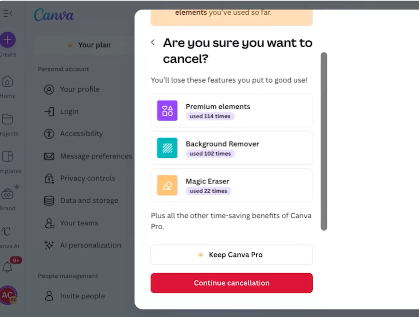 Because instead of the usual dull confirmation screen, Canva showed me a list of exactly how I was using the pro plan - and how many times.
